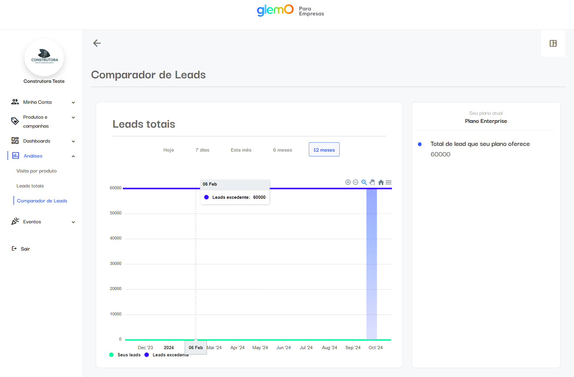 A aba Comparador de Leads é uma ferramenta poderosa para avaliar o desempenho da sua empresa em relação ao mercado. Nesta seção, você encontrará um gráfico que compara o número de leads que sua empresa recebeu com a média geral do sistema, considerando outras empresas que estão no mesmo plano que o seu.