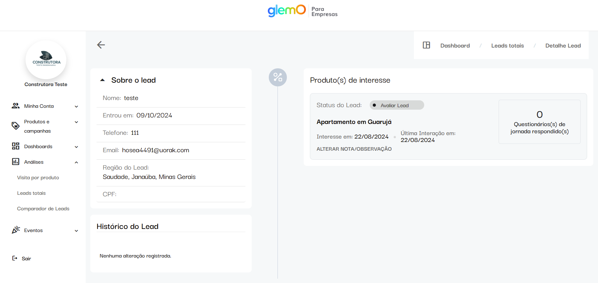 Detalhes do Lead oferece uma visão aprofundada das informações de cada lead capturado, proporcionando insights valiosos sobre o perfil e o progresso do cliente na jornada de compra. Esta tela permite que os usuários acompanhem e analisem o engajamento do lead com as etapas do processo, facilitando um atendimento mais personalizado e eficiente.