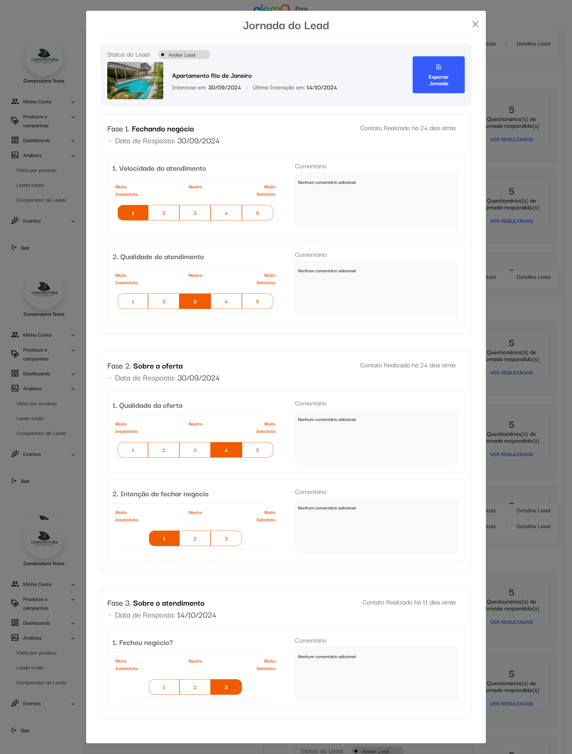 Ao acessar a opção "VER RESULTADOS" do lead, abaixo do indicador de quantidade de questões da jornada do leads respondidas, é acessado a ficha de jornada desse lead, com as métricas e opiniões desse lead durante a jornada