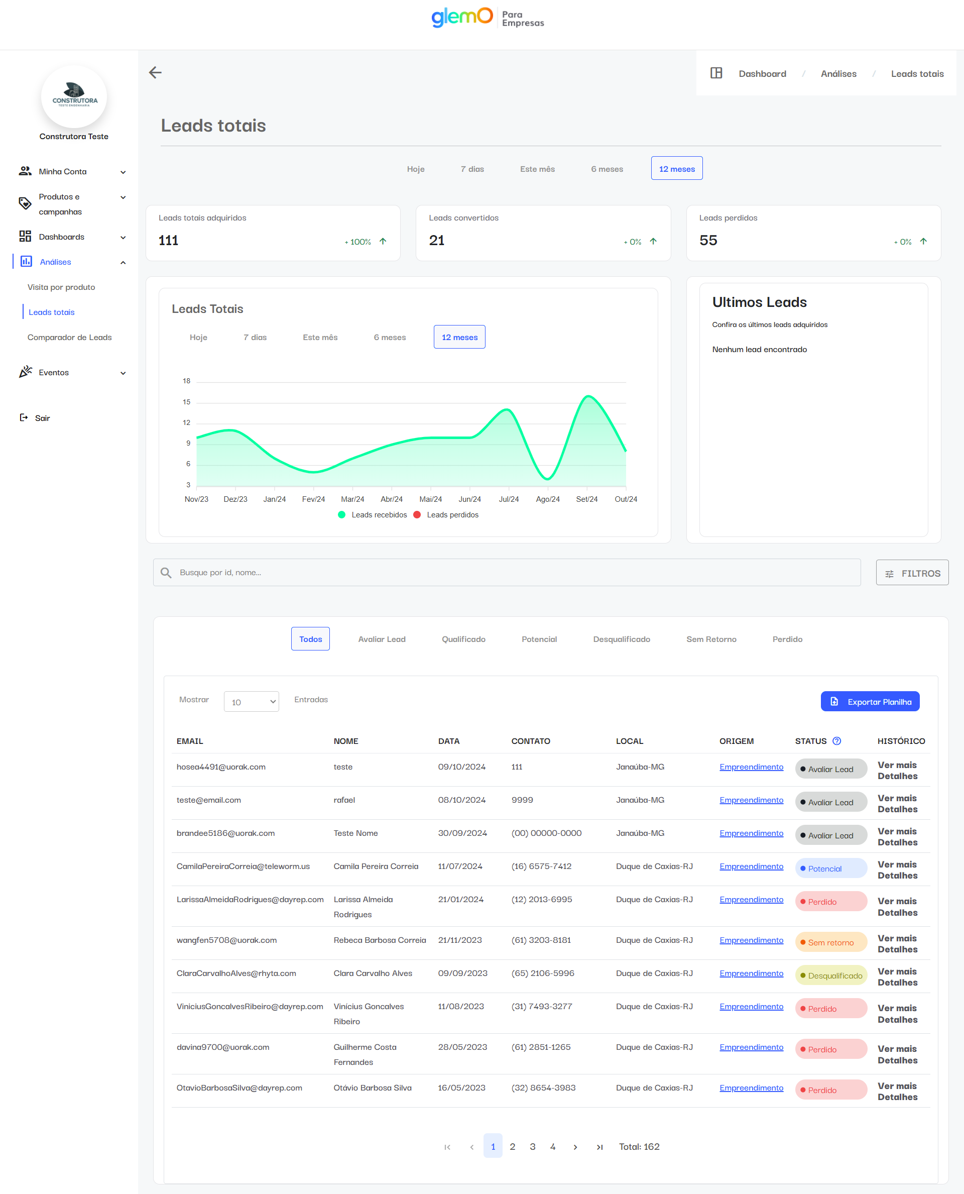 O menu Leads Totais oferece uma visão abrangente de todos os leads gerados em sua plataforma, permitindo uma análise detalhada e o acompanhamento efetivo das oportunidades de negócio.