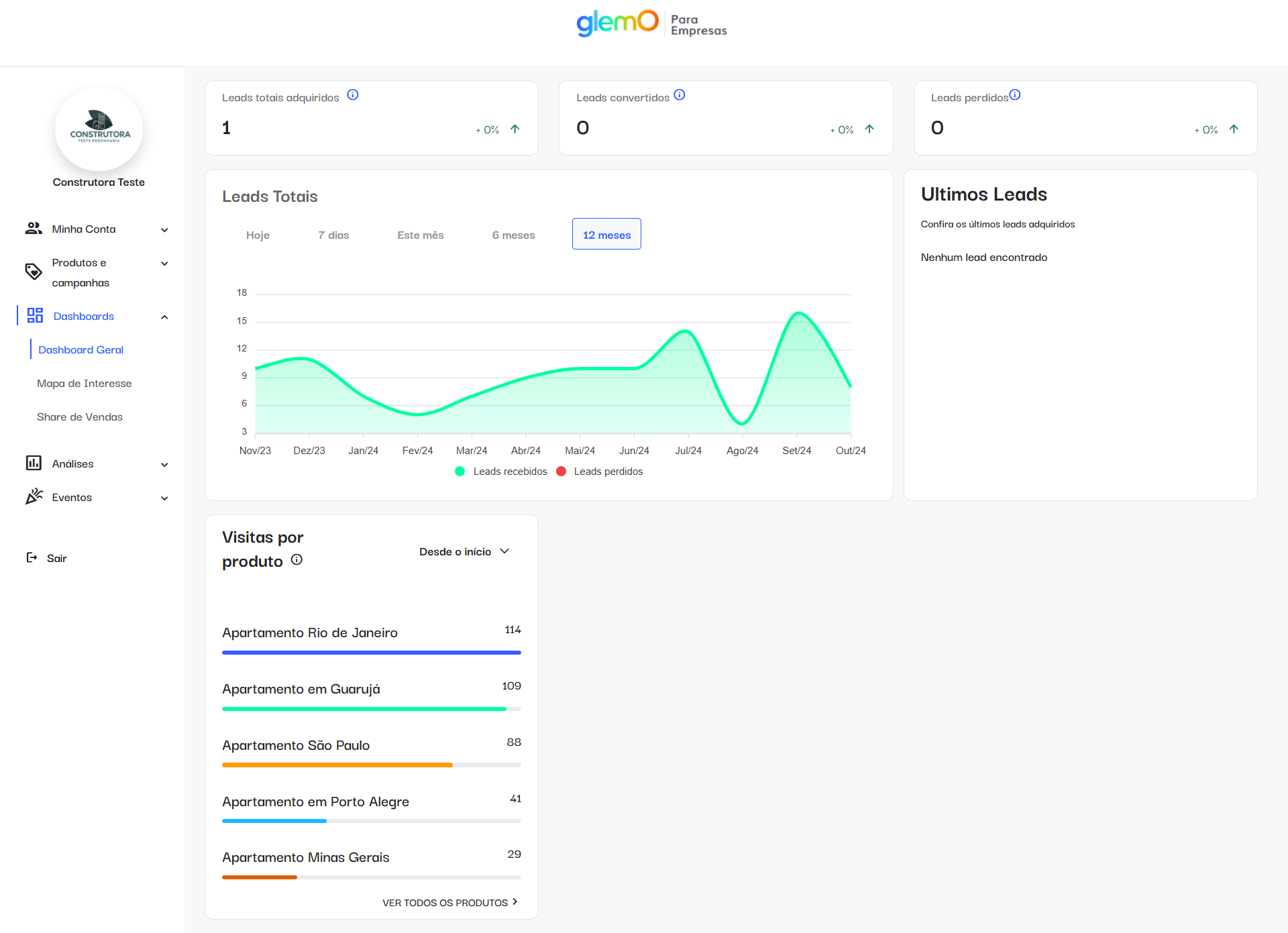 Leads Totais: Apresenta o número total de leads gerados, permitindo acompanhar o volume de potenciais clientes interessados nos produtos cadastrados.