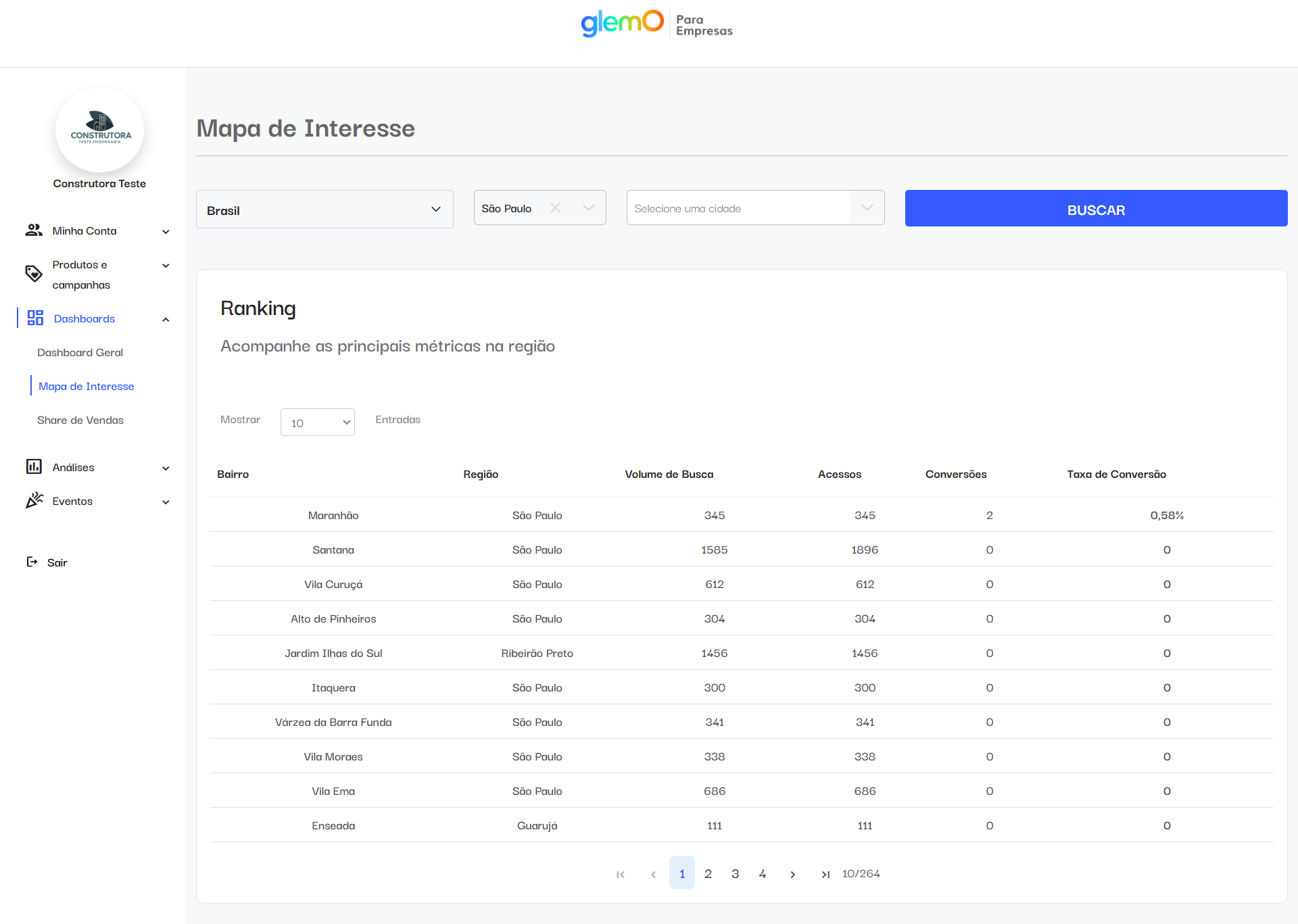 Além disso, o sistema conta um mapa de interesse que permite visualizar as métricas de cada produto conforme a região selecionada (estado e cidade).
